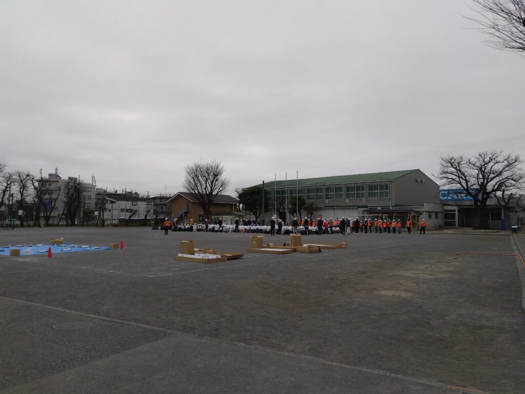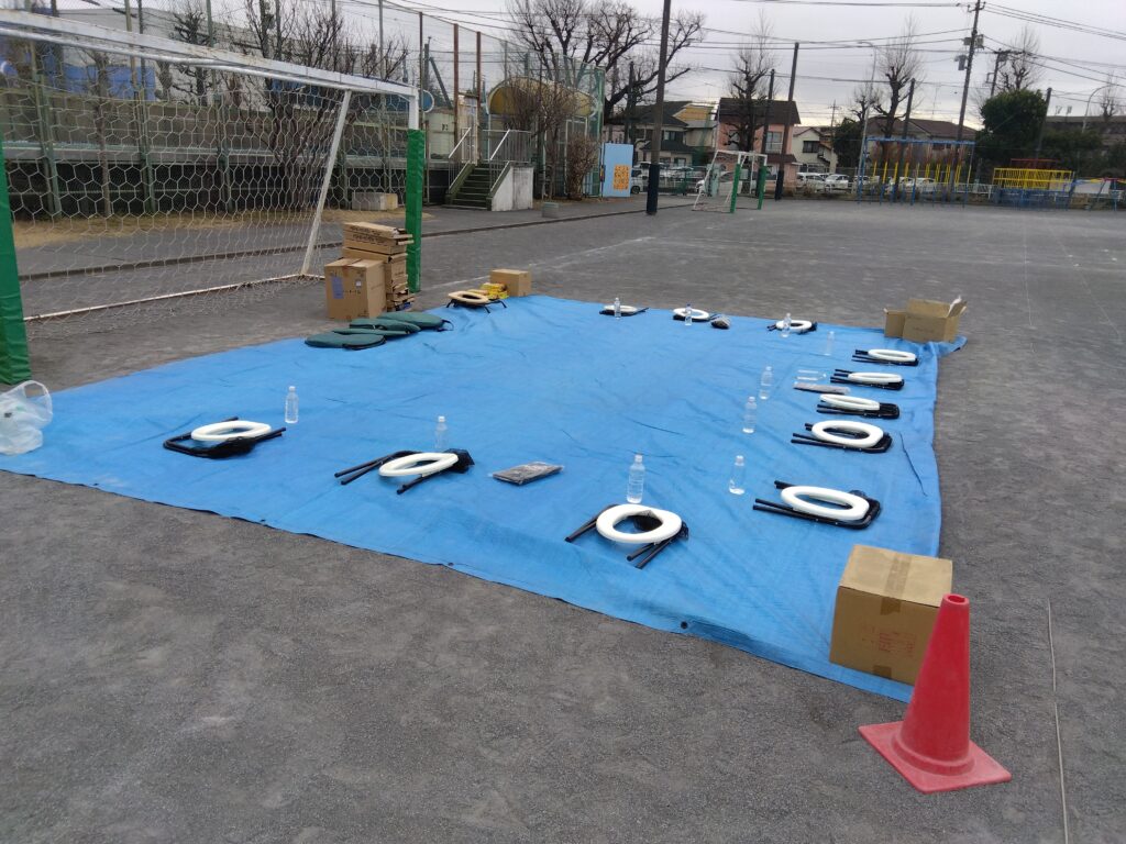 備蓄品を配る人、簡易トイレを設置する人、段ボールベッドを作る人などに分かれてみんな真剣に取り組んでいました。